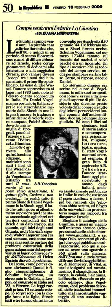 - Dal Notiziario N.1 - Anno XIV - del Febbraio 2000 - UNA NUOVA INIZIATIVA EDITORIALE PER DIFFONDERE LA BIBBIA (Alessandro Zaccuri, Una Bibbia formato best-seller, "Avvenire", mercoledì 1 ° dicembre I 999 ). Primo luogo comune: in Gran Bretagna la Bibbia è più conosciuta che in Italia. Vero, ma non troppo, considerato che fino a poco tempo fa nelle librerie inglesi era pressoché impossibile trovare edizioni di singoli libri della Sacra Scrittura. Innari e Bibbie complete finché se ne vuole, nella gloriosa traduzione seicentesca di Re Giacomo o in quelle più moderne che si sono via via succedute, ma guai a cercare un Cantico dei Cantici sciolto o un'Apocalisse stampata in proprio. Mentre in Italia com'è noto, edizioni del genere esistono e prosperano da diversi anni. Secondo luogo comune: la Bibbia è un best seller. Questo è vero, verissimo, come dimostra 1'iniziativa di Canongate, una casa editrice con sede a Edimburgo che. nel1'autunno del 1998, ha lanciato sul mercato una Bibbia davvero particolare. Suddivisa in singoli libri, tanto per iniziare, e con introduzioni appositamente scritte da autori che, a prima vista, non sembrerebbero avere troppo a che fare con le sottigliezze dell'esegesi. Il tutto con smaglianti immagini di copertina e al costo di una sterlina al volume. Il risultato? In un anno i primi dodici titoli della serie «Pocket Canons» (dicitura che gioca sull'assonanza tra il nome della casa editrice e il concetto di «canone»> ha complessivamente venduto un milione di copie, trasformandosi nel frattempo in un'operazione internazionale. In questi giorni la «Bibbia degli scrittori», come ormai viene chiamata, sbarca anche in Italia, pubblicata nei Tascabili Einaudi (il prezzo, anche in questo caso, è appetibile: 10.000 lire al volume). Dei tre titoli d'esordio, due provengono dritti dritti dalla versione inglese - si tratta dell'Esodo introdotto dall'israeliano David Grossman e del CanticodeiCantici con prefazione di Antonia S. Byatt, la raffinata autrice di Possessione e Latorre di Babele - mentre il terzo chiama in causa un autore italiano. Franco Lucentini, che per una volta si separa dal1'alter ego Fruttero per commentare il Vangelo secondo Luca. Altre firme della scuderia Einaudi, da Mario Rigoni Stern a Sebastiano Vassalli, fino al Nobel José Saramago, entreranno in scena prossimamente. Non si tratta dell'unica differenza tra edizione inglese ed edizione italiana. I «Libri della Bibbia» nostrani vengono presentati nella traduzione di Fulvio Nardoni, apparsa per la prima volta negli anni Sessanta per i tipi della Libreria Editrice Fiorentina. In appendice, un essenziale inquadramento storico-esegetico a cura di Agnese Cini Tassinario, Presidente dell'Associazione laica di cultura biblica «Biblia». La consulenza generale, infine è affidata a Paolo De Benedetti. Uno spiegamento di forze decisamente più considerevole di quello dei «Pocket Canons», che si accontentano di riproporre il testo della Bibbia di Re Giacomo, con tanto di autorizzazione della Società biblica scozzese. Un copyright che tuttavia non è bastato a mettere la Canongate al riparo da critiche e polemiche [...]. Non è ancora chiaro se 1'edizione Einaudi riproporrà anche le prefazioni controverse. Di sicuro invece c'è che la seconda serie dei «Pocket Canons», uscita poche settimane fa sul mercato inglese, riserva più di una sorpresa. Molto interesse ha suscitato, per esempio, la prefazione al Salterio in cui Bono, leader e cantante degli U2, paragona i Salmi ai Blues e presenta re David come un Elvis Presley ante litteram. Voglia di stupire? Non solo, a giudicare dalla serietà con cui Bono spiega come mai War, uno degli album degli U2, si concluda proprio con 1'accorata invocazione di soccorso del Salmo 40. In programma, ma non ancora in libreria, anche un'edizione delle cosiddette Lettere cattoliche (ossia le epistole di Giacomo, Pietro, Giovanni e Giuda) accompagnate dalle riflessioni del Dalai Lama. Un segno. forse, che tra una polemica e un luogo comune sul «canone» di fine millennio soffia anche il vento del dialogo interreligioso. Dal quotidiano "La Repubblica" del 18 febbraio 2000, abbiamo tratto il seguente "spot", che pubblichiamo volentieri porgendo alla Giuntina e ai suoi Dirigenti, legati a BIBLIA da un lungo rapporto di fruttuosa collaborazione, complimenti e auguri per i prossimi e numerosi anniversari, ventennali ed oltre, a venire: